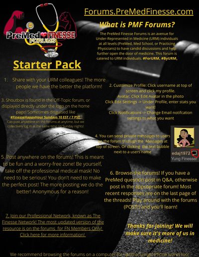 The PreMed Finesse Forums is an avenue for Under-Represented in Medicine (URM) individuals at all levels (PreMed, Med School, or Practicing Physician) to have candid discussion and help further open the door of medicine. This forum is catered to URM individuals. For URM, By URM.